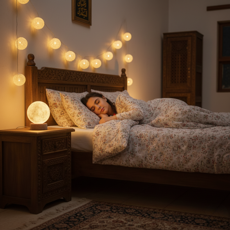 القاعدة الخشبية تخفي بداخلها إضاءة LED ناعمة تبعث ضوءاً دافئاً يملأ الغرفة بالهدوء. مثالية كـ night light في غرفة النوم، أو لإضفاء جو رومانسي في غرفة المعيشة، أو كضوء مطمئن لطفلك قبل النوم.